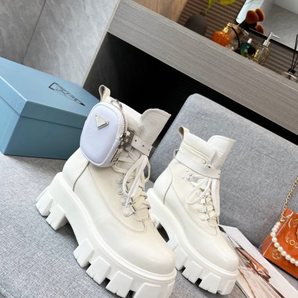 Monolith 靴子体现了 Prada 的混合灵魂。它们采用尼龙(一种传统上与该品牌联系在一起的工业面料)制成,其特点是材料和风格代码的结合,形成宽大的设计和厚实的块状鞋底。鞋子上装饰有一个带有标志性搪瓷金属三角形徽标的可拆卸小袋。