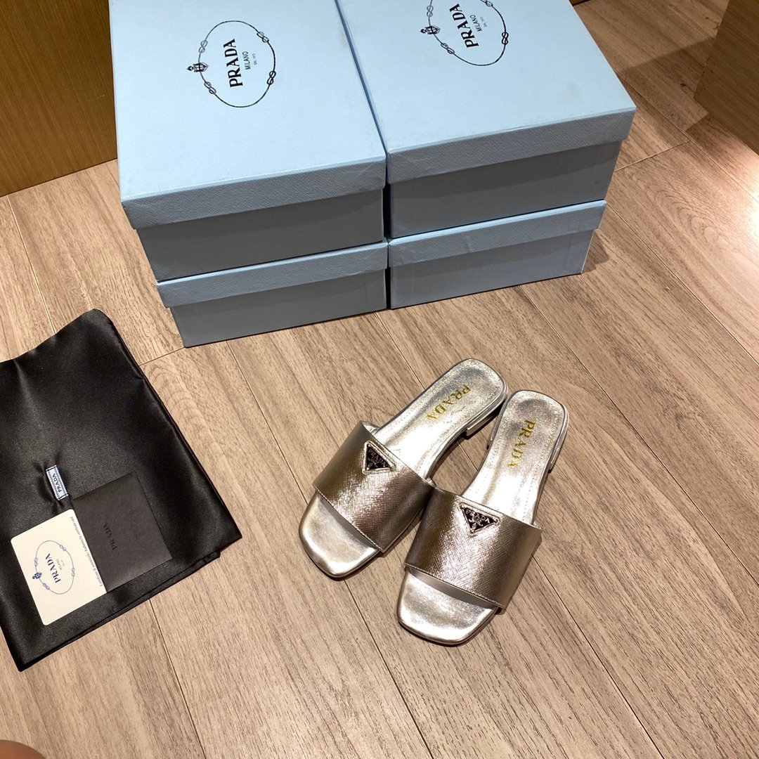 这些时尚的拖鞋采用品牌标志性的 Saffiano 材质制成,饰有三角形标志,彰显出标志性的魅力。 Saffiano 是奢华的代名词,与传统的意大利产品生产联系在一起:这种高品质是由其交叉纹理和打蜡表面定义的。