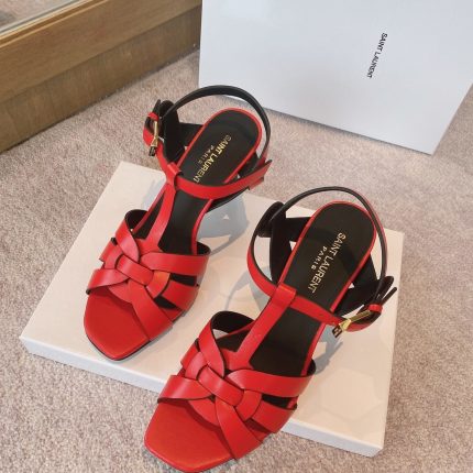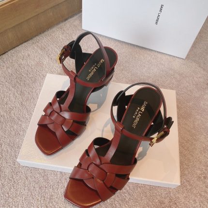 高跟细高跟凉鞋,带缠绕带,采用方头和可调节踝带,刻有 Saint Laurent Paris 字样。