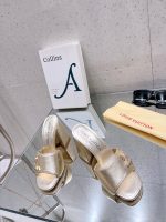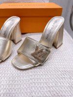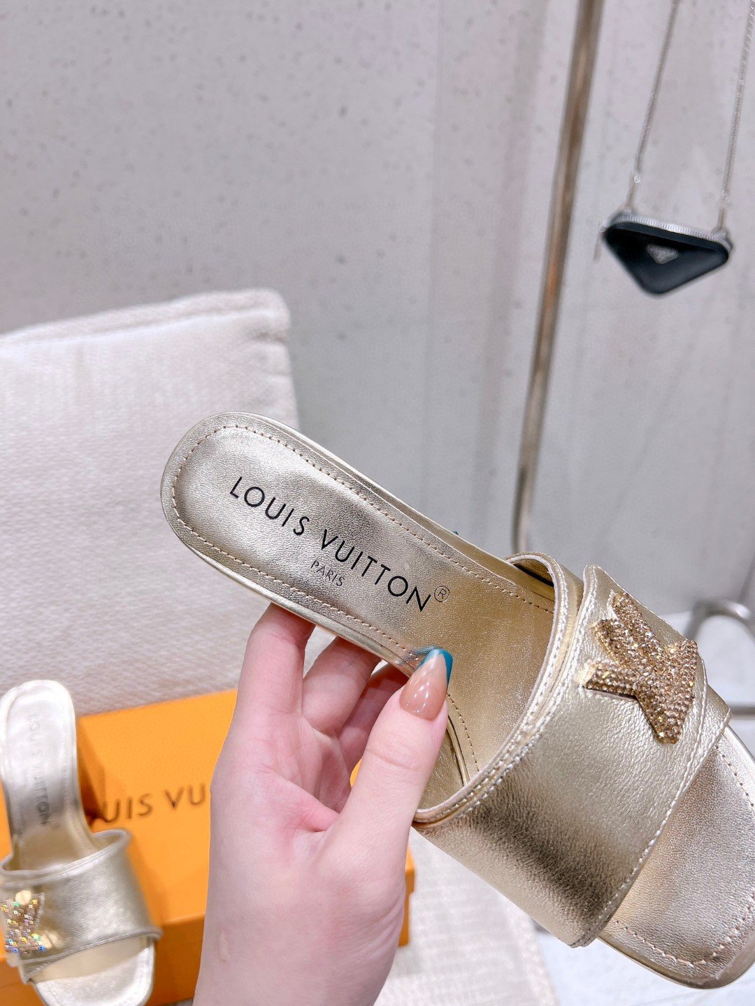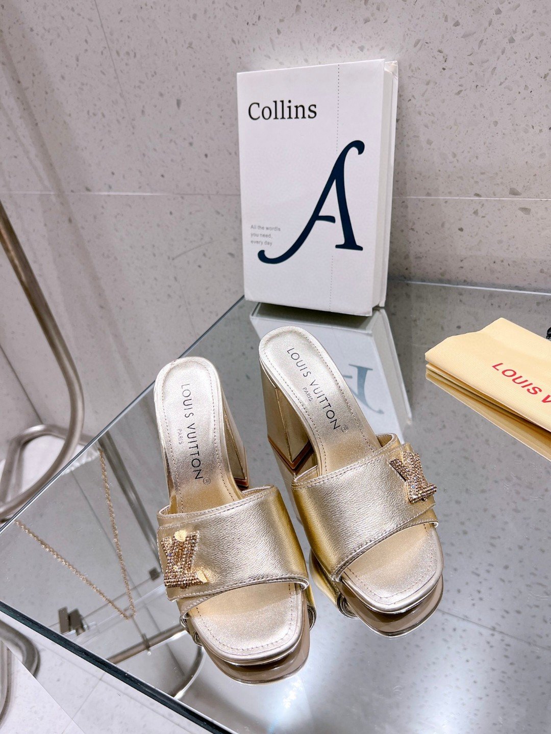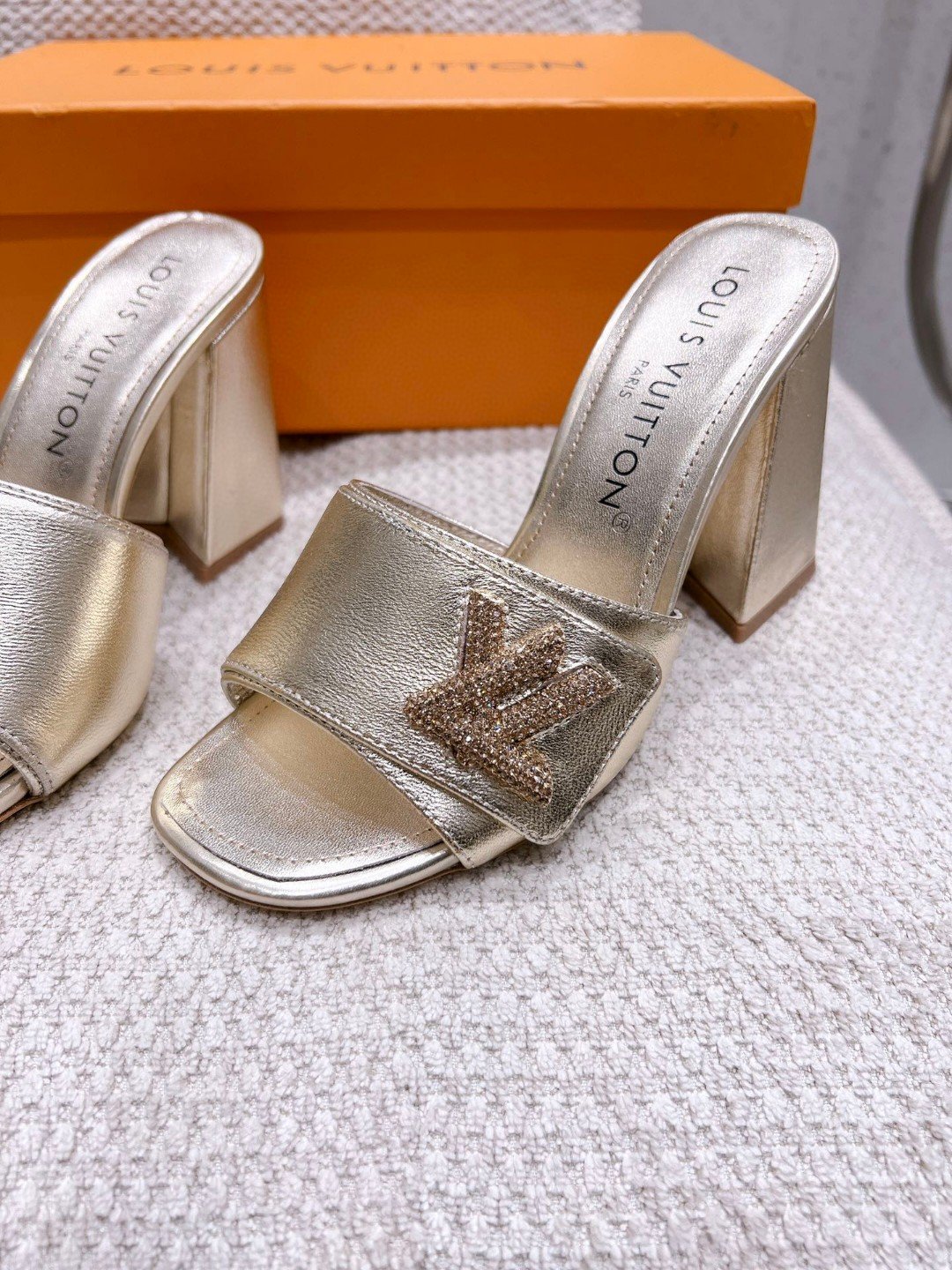 金属色为 Shake 穆勒鞋增添魅力,这款现代风格以其 V 形高跟粗跟而闻名。宽大的前肩带饰有宝石般的 LV 配饰,完全覆盖水晶,灵感源自标志性的 Twist 手袋。鞋垫上印有超大号 Louis Vuitton 标志。